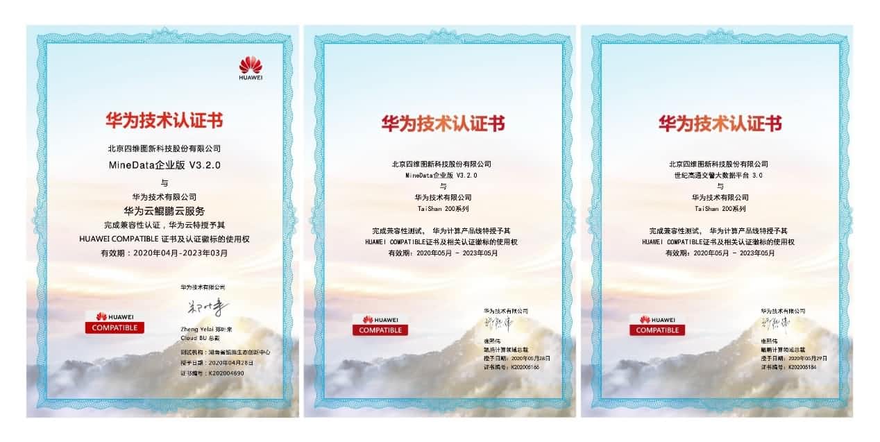 日前,,,,,,,金世豪两项大数据平台产品通过华为产品兼容性测试并获得认证证书。。。。。。。其中,,,,,,,MineData企业版V3.2.0不但通过了华为云鲲鹏云服务兼容性认证,,,,,,,并资助公司顺遂成为华为鲲鹏凌云伙伴,,,,,,,还完成了华为TaiShan200系列兼容性测试认证。。。。。。。世纪高通交警大数据平台3.0则通过了华为TaiShan200系列的兼容性测试认证。。。。。。。测试效果批注,,,,,,,两项产品整体运行稳固,,,,,,,在功效、性能及兼容性方面体现优异,,,,,,,可周全知足用户需求。。。。。。。