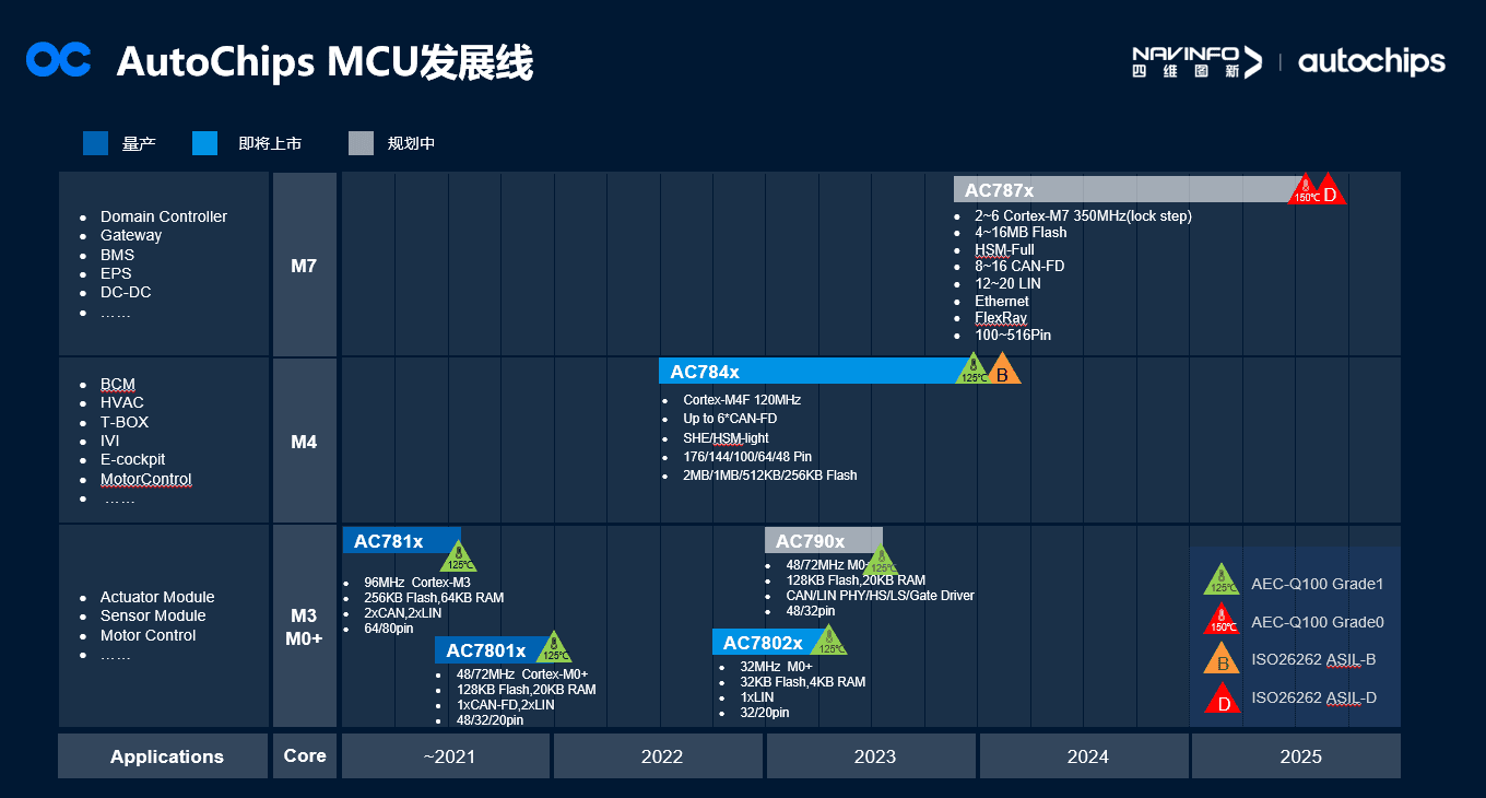 作为国产车规MCU领航者,,,,,, , ,杰发科技MCU产品线从基于M0+和M3内核的AC780x系列和AC781x系列主打小节点执行层角色,,,,,, , ,到基于M4F内核的AC784x系列作为中心力量,,,,,, , ,再到未来基于M7内核的AC787x系列拥有高算力大Pin角主打域控制器角色,,,,,, , ,形成了汽车MCU领域全笼罩。。。。。。。李清庐体现,,,,,, , ,杰发科技希望依附久远的产品战略妄想和富厚多样的MCU产品线为中国汽车“新四化”生长孝顺一份力量。。。。。。。